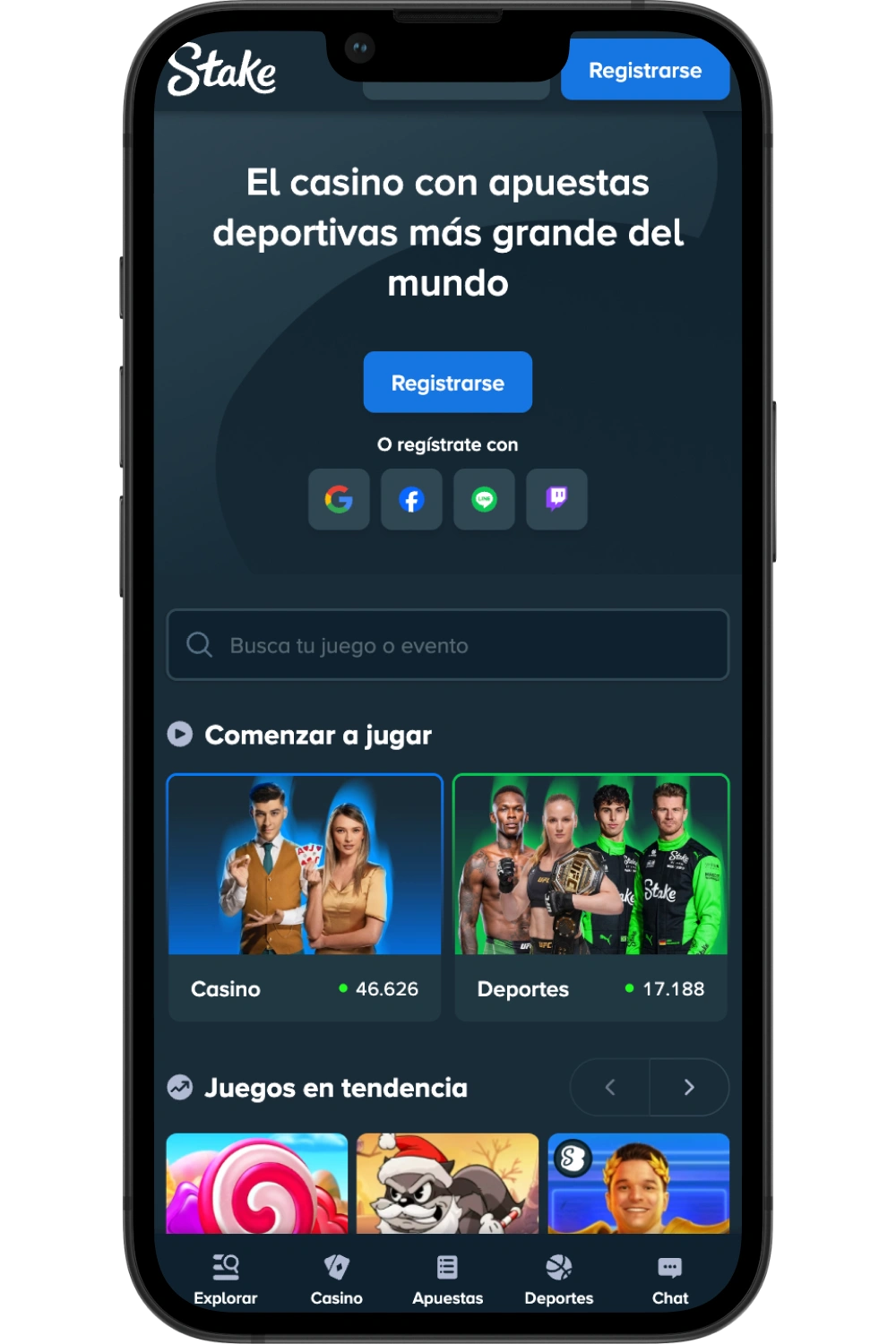 Descargá el archivo APK desde el sitio oficial de stake. La app tiene la misma funcionalidad que el escritorio: depósitos, retiros, todos los juegos y sportsbook.